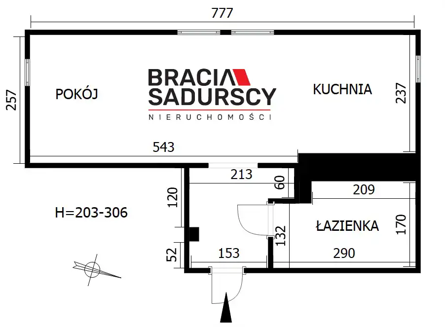 Na powierzchni 27,38 m² znajduje się salon połączony z aneksem kuchennym, przedpokój oraz łazienka.