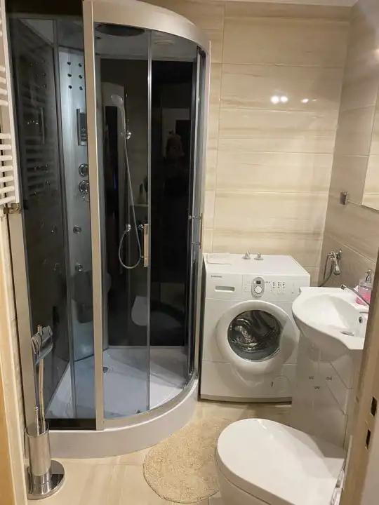 - Łazienka z kabiną prysznicową oraz pralką,
