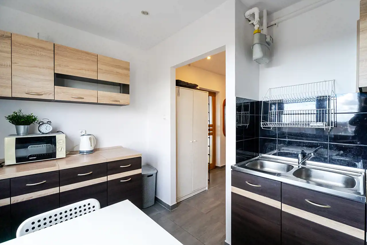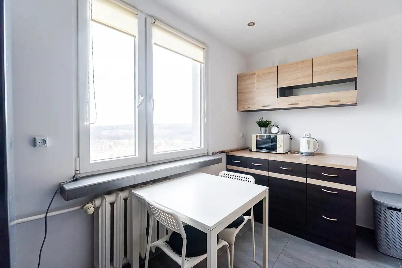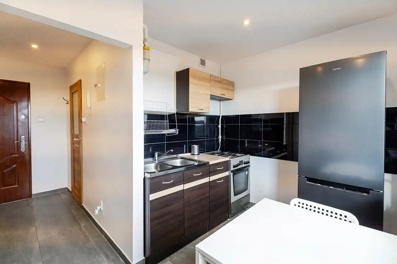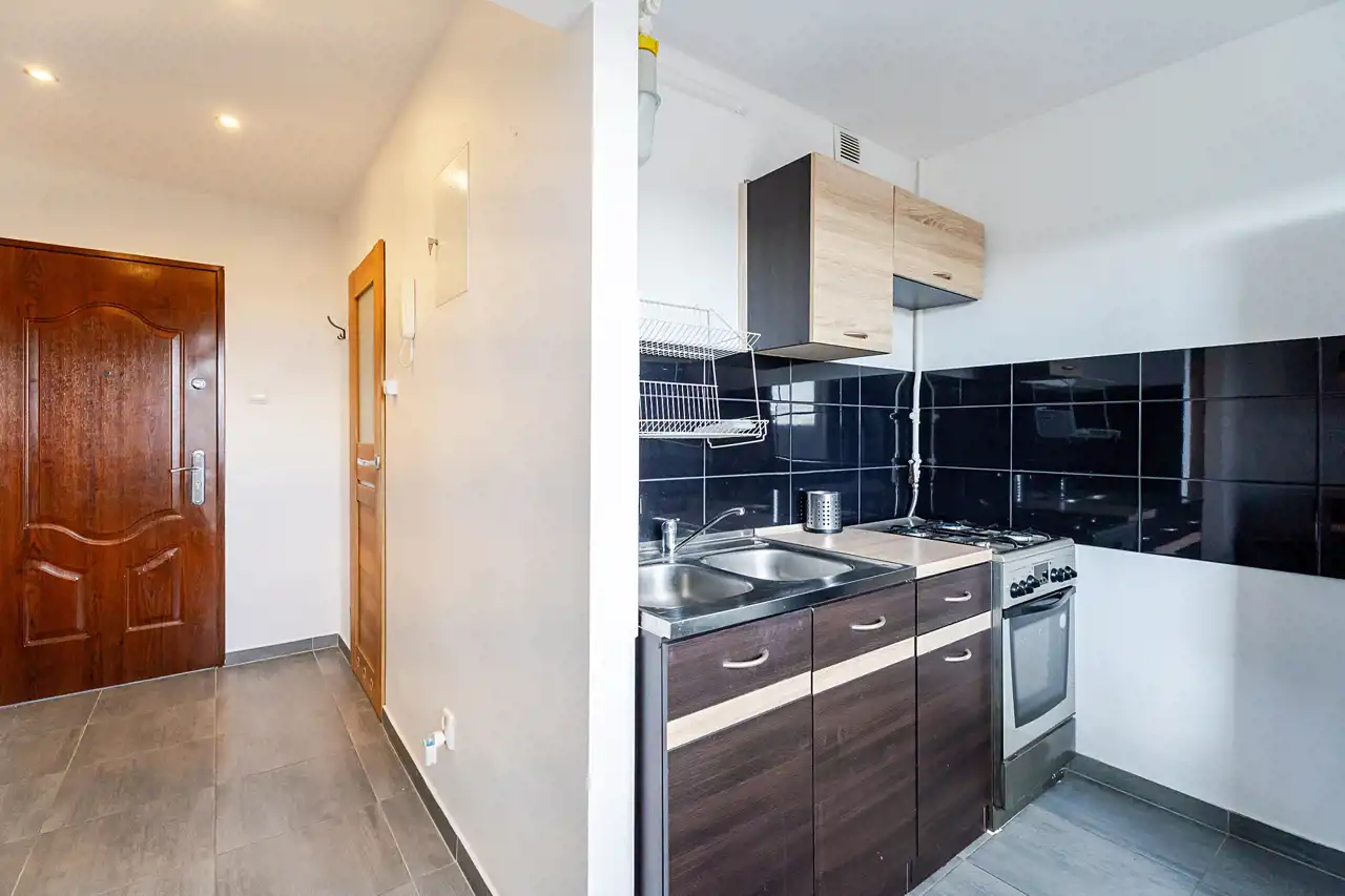- duża, oddzielna kuchnia z oknem – rzadkość w kawalerkach, ogromny atut dla najemców