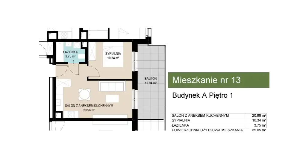 - Charakterystyka mieszkania 35.05 m2, 2 pokoje