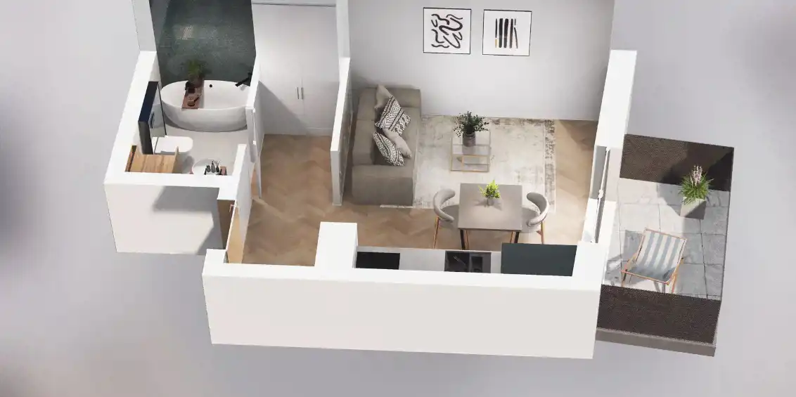 Mieszkanie składające się z pokoju z aneksem kuchennym, przedpokoju, łazienki oraz balkonu