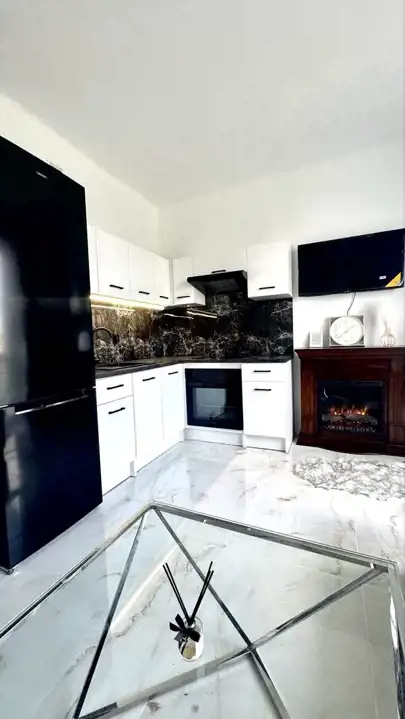 - Nowoczesna kuchnia z ledowym oświetleniem, płytą grzewczą, piekarnikiem, nową lodówką i pralką