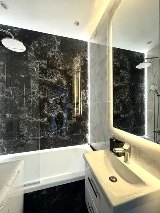 - Elegancka łazienka z wanną, z wbudowanym podświetleniem LED w płytkach