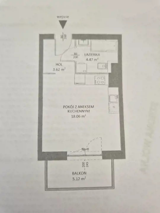 - pokój, aneks kuchenny, łazienka z toaletą, przedpokój