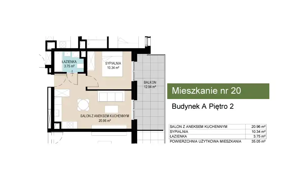 - Charakterystyka mieszkania 35.05 m2, 2 pokoje