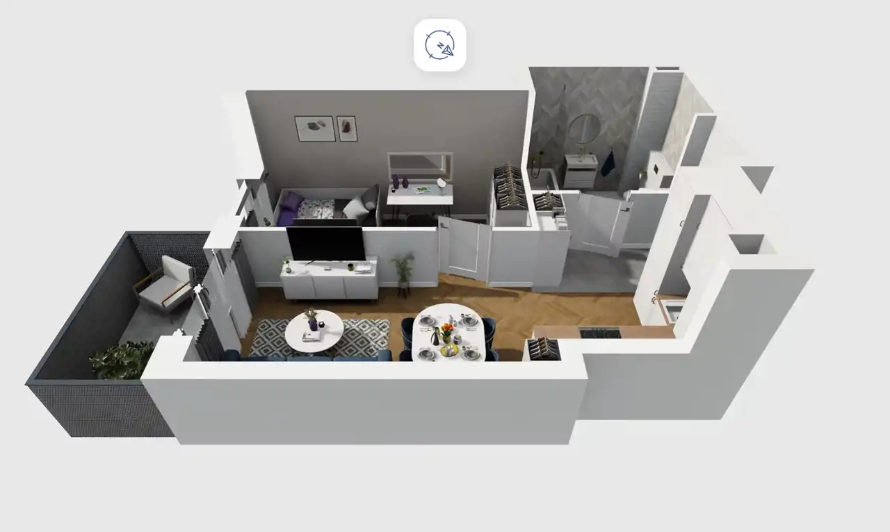 Mieszkanie składające się z salonu z aneksem kuchennym, sypialni, przedpokoju, łazienki oraz balkonu