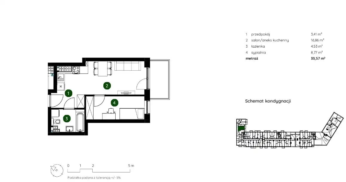 - Charakterystyka mieszkania 33.57 m2, 2 pokoje