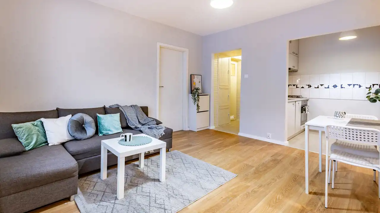 Składa się z kuchni połączonej z salonem, sypialni, łazienki i przedpokoju. Do mieszkania przynależy piwnica o powierzchni 4,38 m2. W 2014 roku został zrobiony generalny remont, który obejmował wymianę instalacji elektrycznej, wymianę podłóg, zrobienie nowej kuchni. W tym roku mieszkanie zostało odmalowane i jest idealne do wprowadzenia się bez dodatkowych kosztów. Meble i sprzęty widoczne na zdjęciach mogą zostać w cenie. Kuchnia jest wyposażona w płytę gazową, piekarnik, lodówkę i zmywarkę.