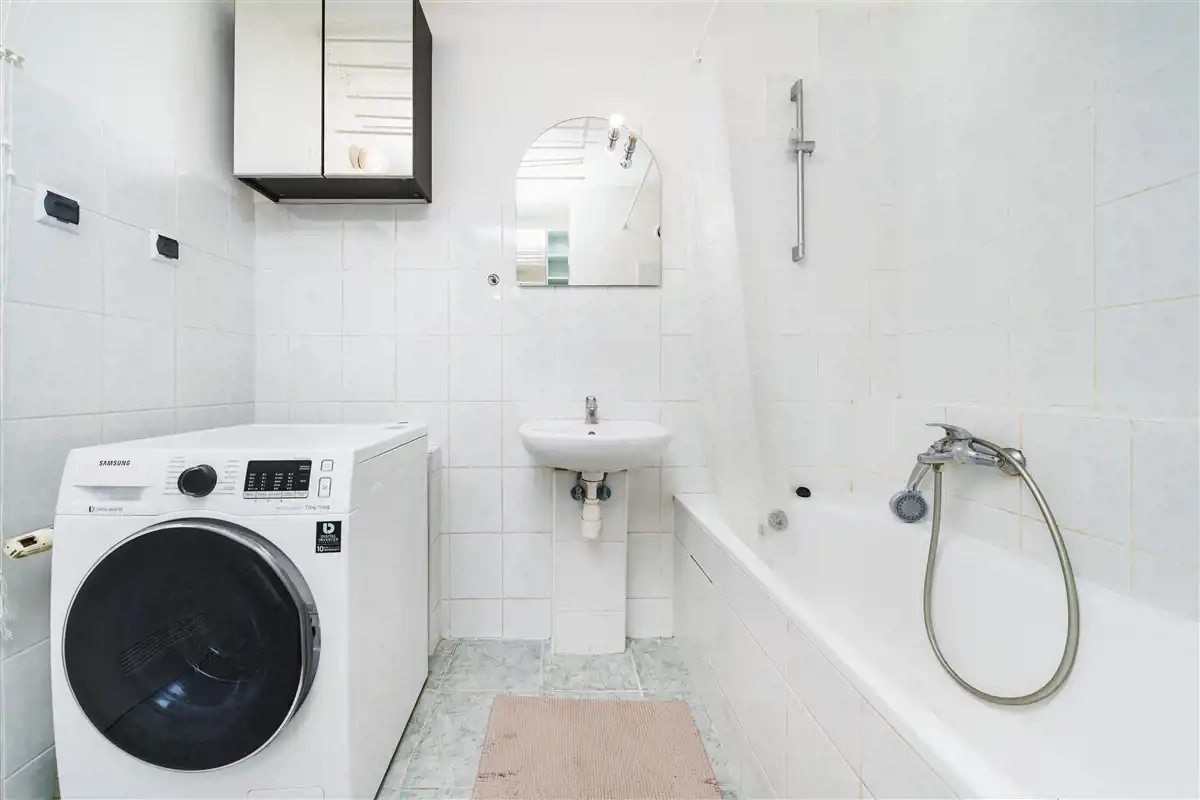 Na podłodze w pokoju są panele, natomiast w łazience i kuchni są płytki. Łazienka wyposażona w wannę i WC, wykończona w płytkach.