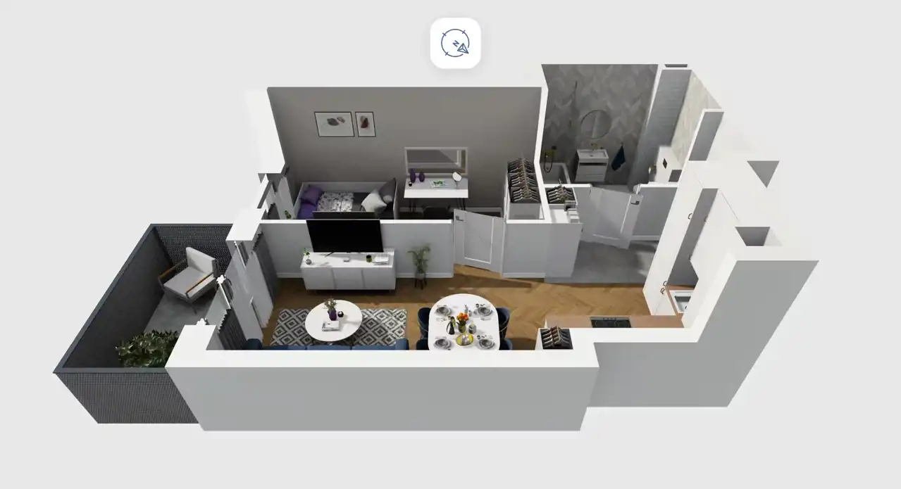 Mieszkanie składające się z salonu z aneksem kuchennym, sypialni, przedpokoju, łazienki oraz balkonu.