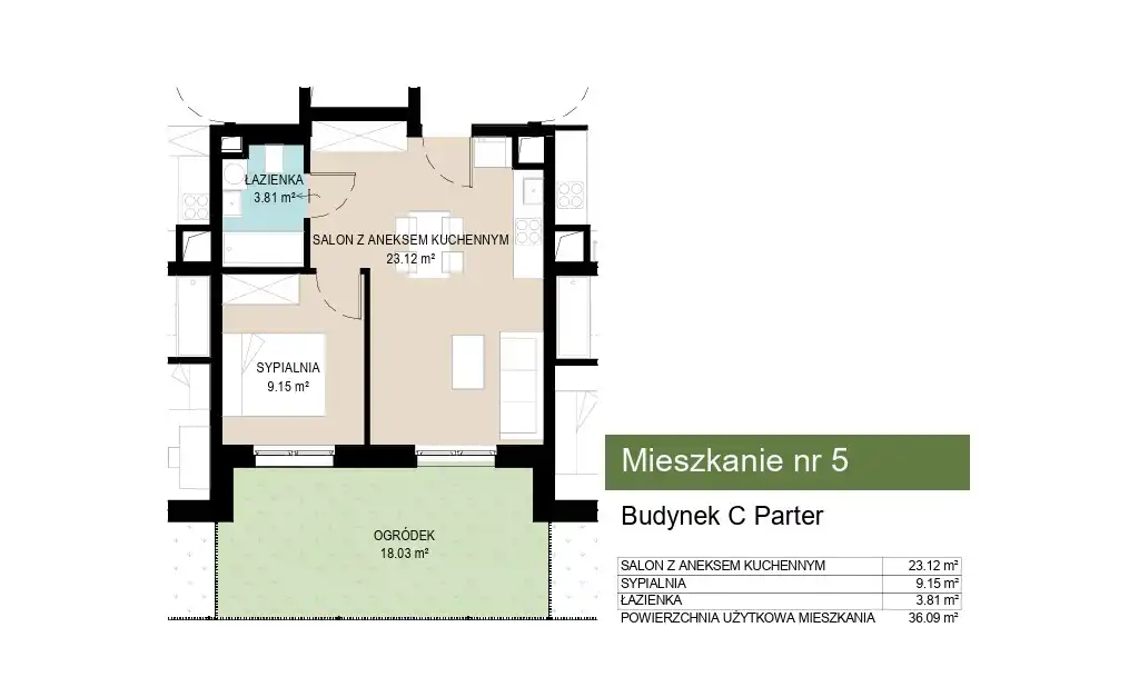 - Charakterystyka mieszkania 36.09 m2, 2 pokoje