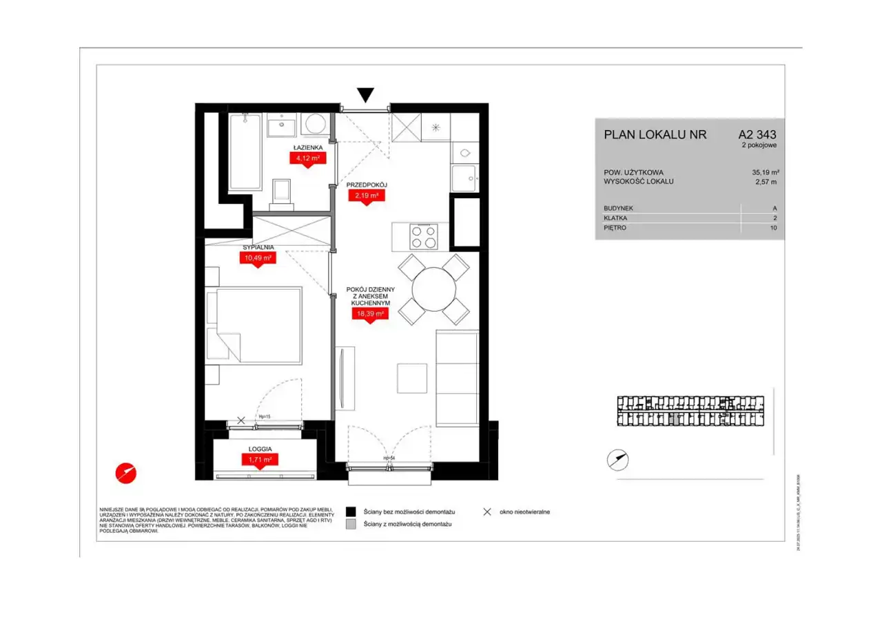 - Przemyślany układ: salon z aneksem 16,39 m², sypialnia 10,49 m², łazienka 4,12 m², przedpokój 2,19 m². Do tego loggia 1,71 m² – idealna na poranną kawę czy chwilę wytchnienia po pracy.