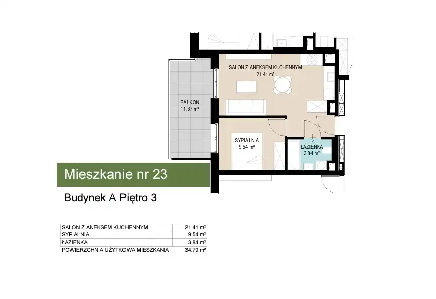 - Charakterystyka mieszkania 34.79 m2, 2 pokoje
