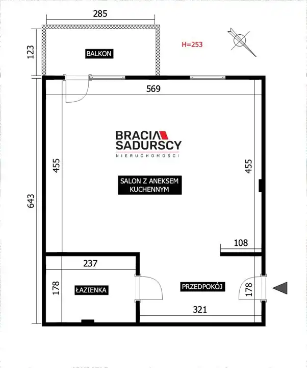 W skład mieszkania wchodzi przestronny pokój z aneksem kuchennym, łazienka oraz balkon o powierzchni 3,81 m².
