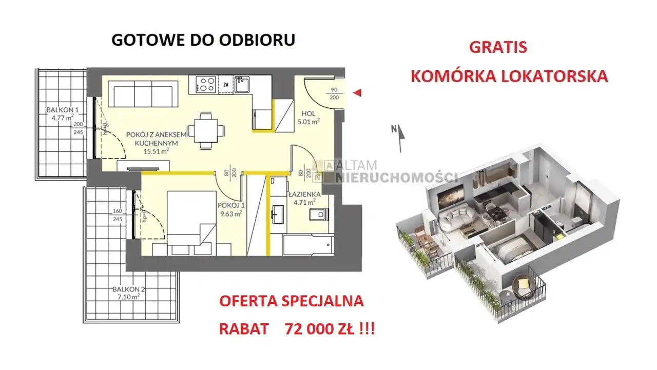 - 2 balkony o pow. 7,10 m2 oraz 4,77 m2