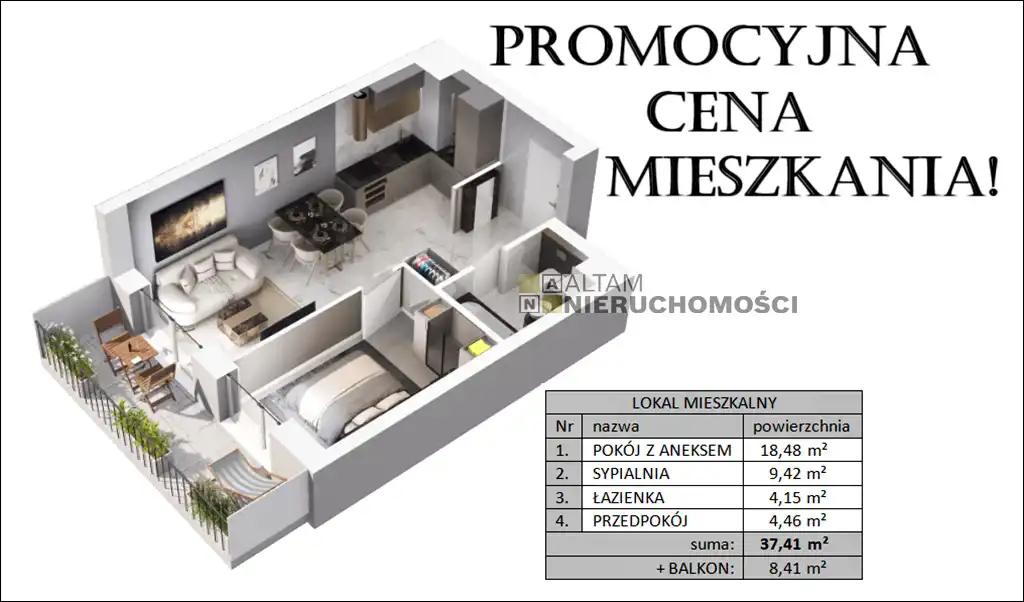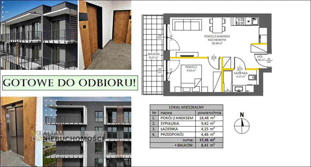 - Charakterystyka mieszkania 37.41 m2, 2 pokoje