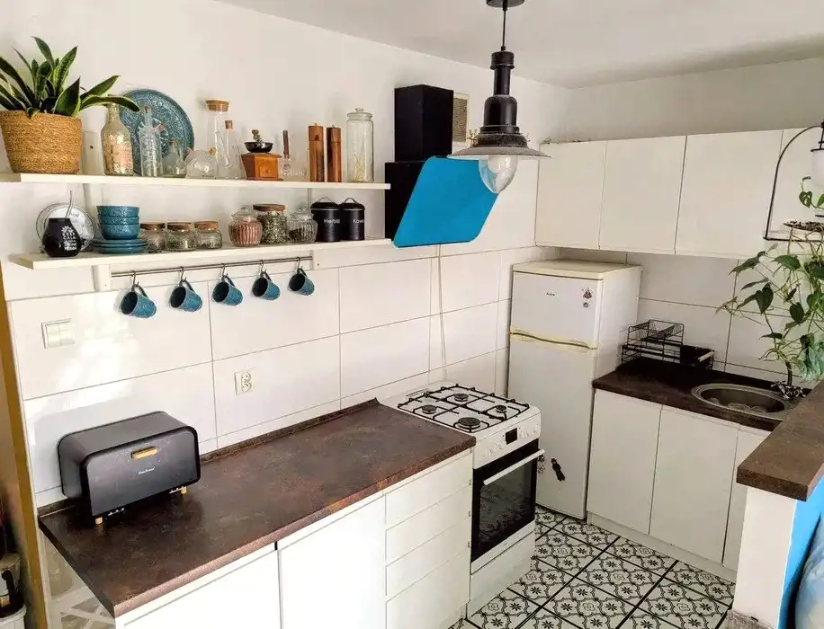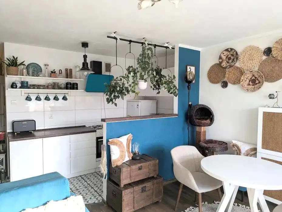 Kuchnia połączona z pokojem, umeblowana i wyposażona.