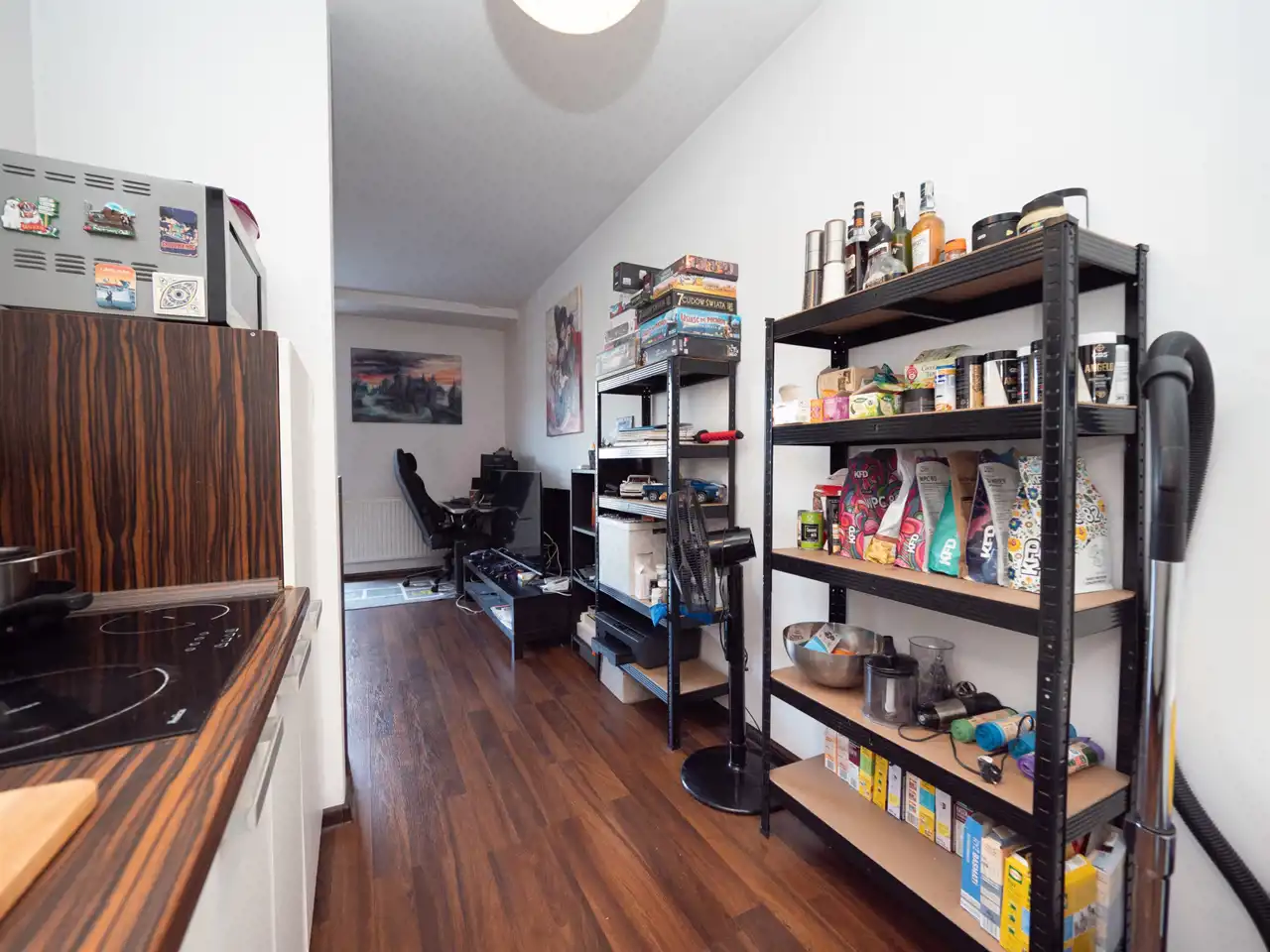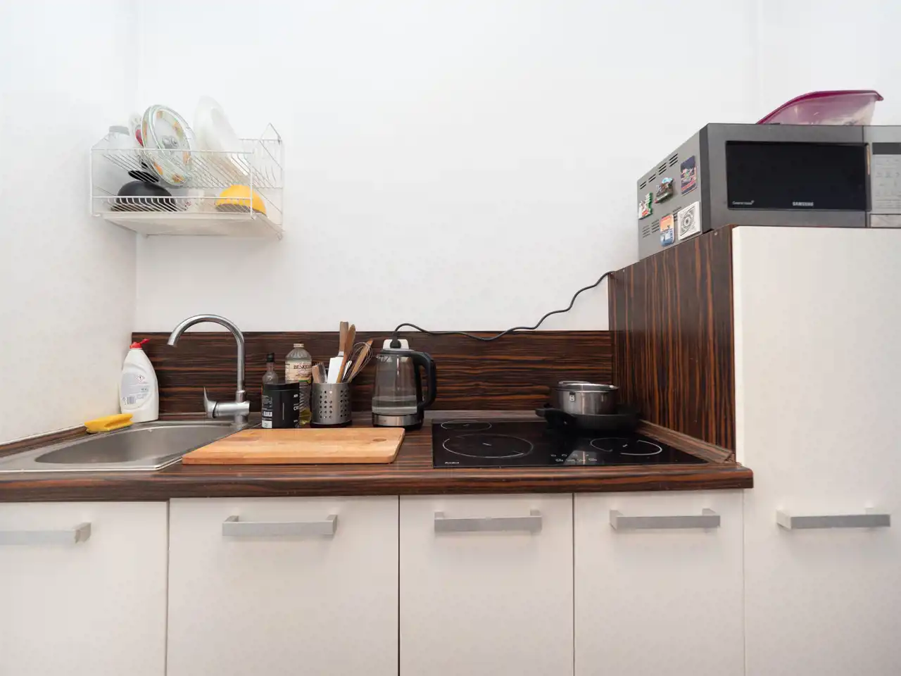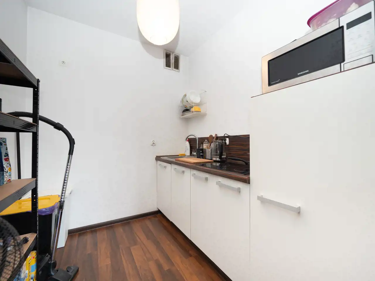 - kitchenette (hob, sink, fridge with freezer, standing and hanging cabinets)