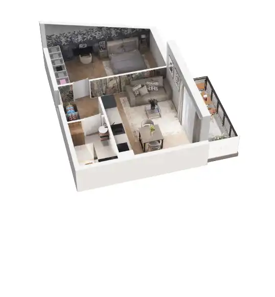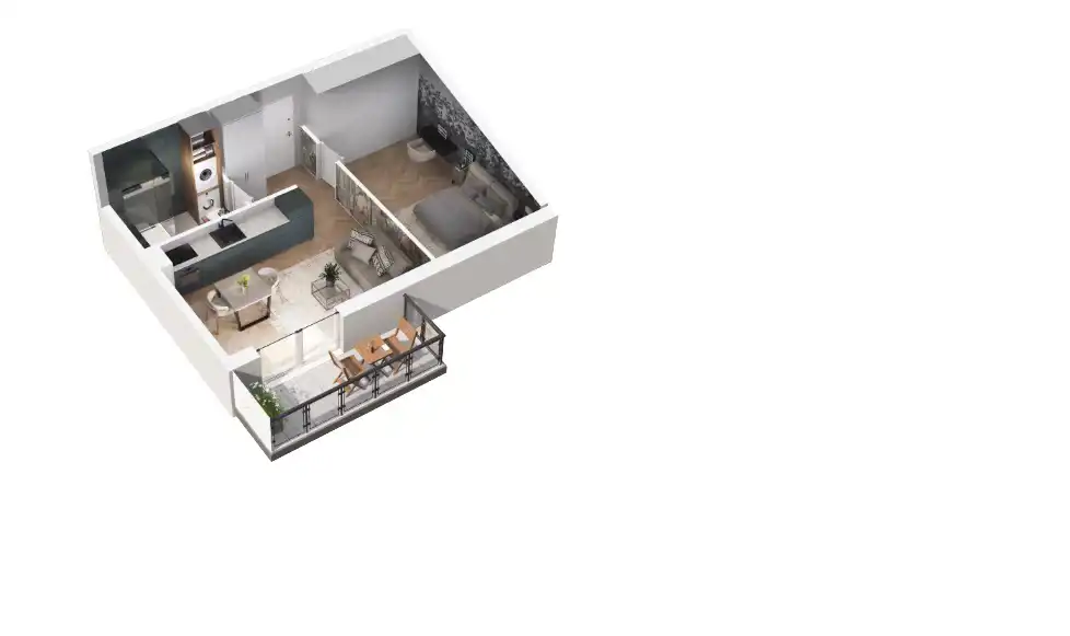 Mieszkanie składające się z salonu z aneksem kuchennym , sypialni, przedpokoju, łazienki oraz balkonu