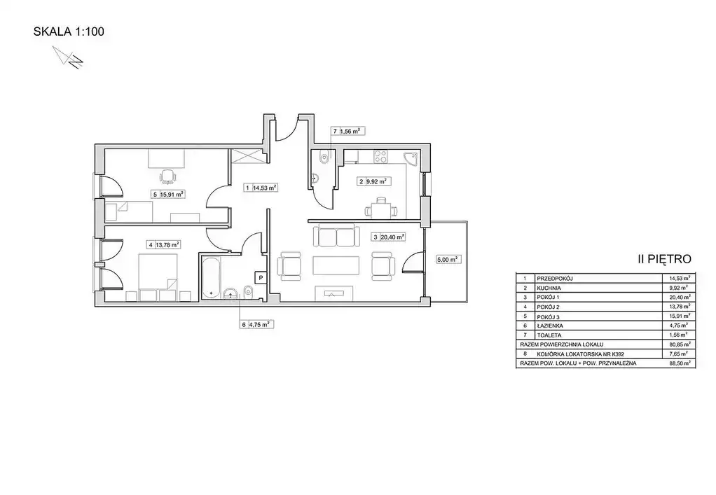 - Charakterystyka mieszkania 80.85 m2, 3 pokoje