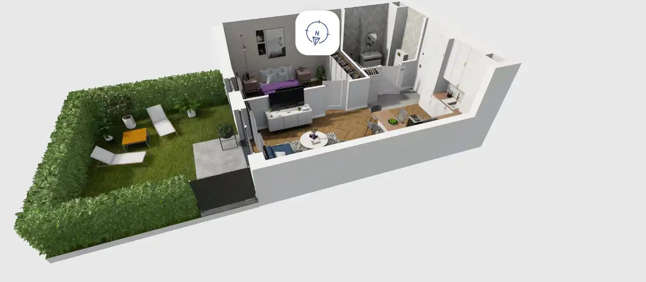 Mieszkanie składające się z salonu z aneksem kuchennym , sypialni, przedpokoju, łazienki oraz ogródka