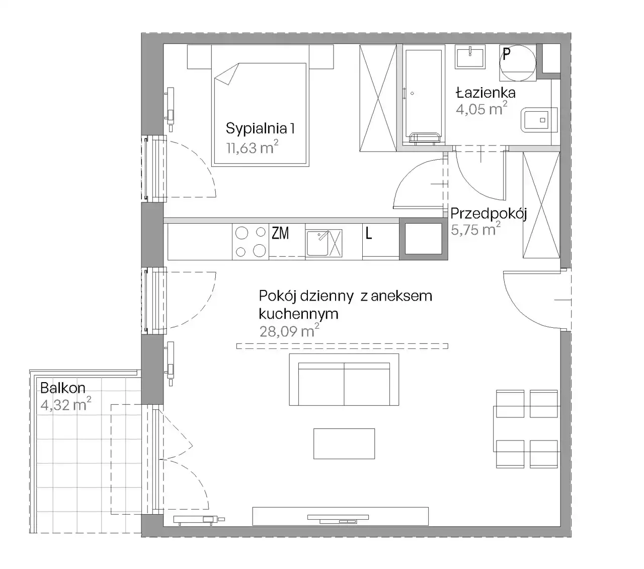 - Charakterystyka mieszkania 36.88 m2, 2 pokoje