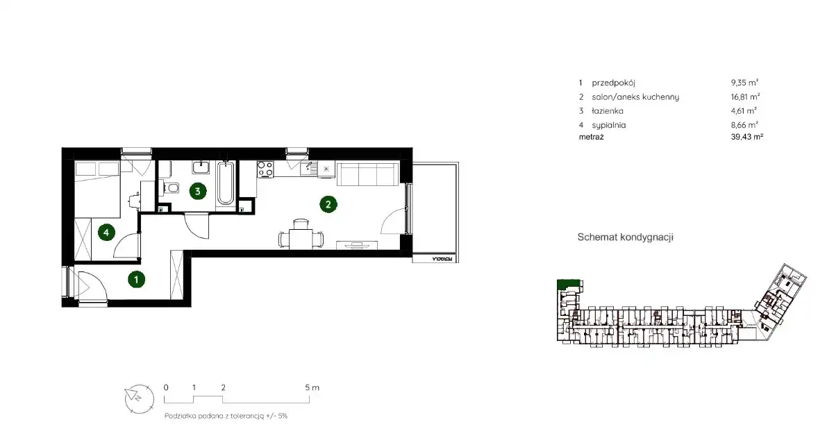 - Charakterystyka mieszkania 39.43 m2, 2 pokoje