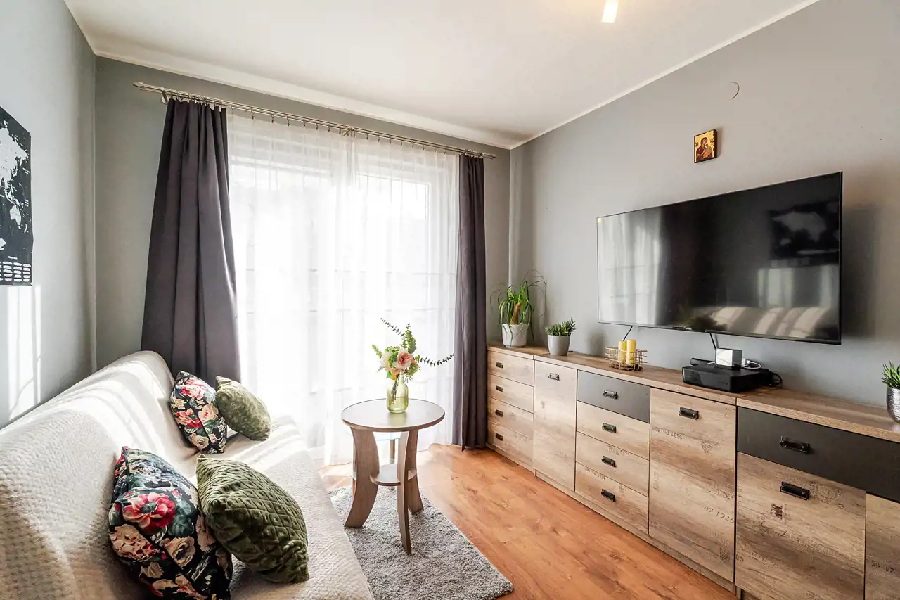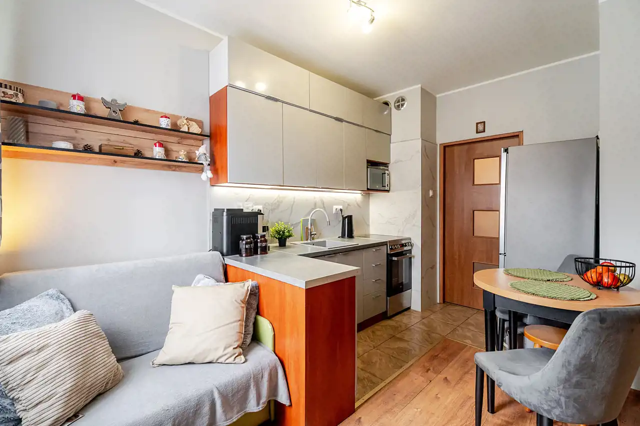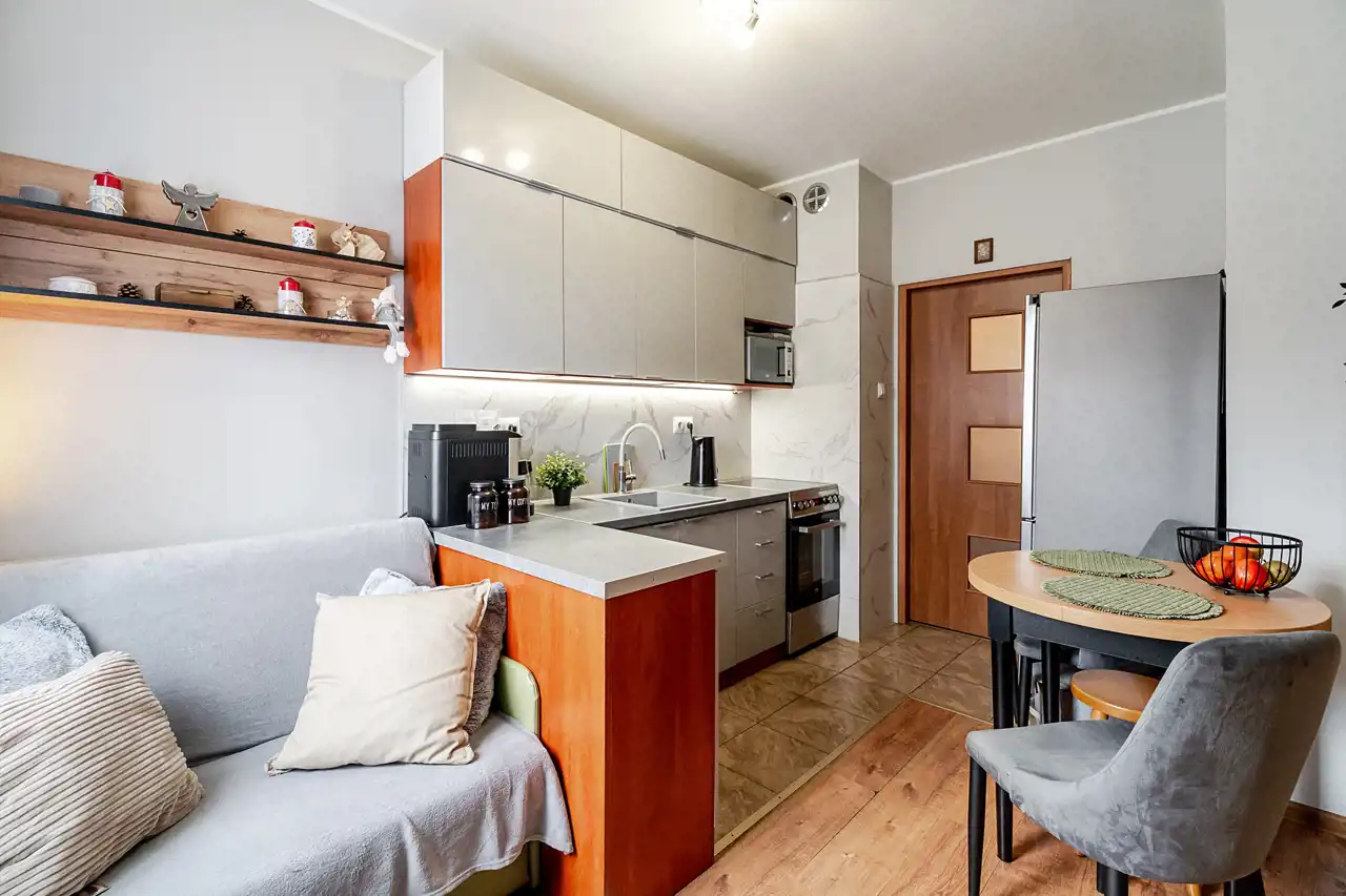 - jasny, przestronny salon z aneksem kuchennym