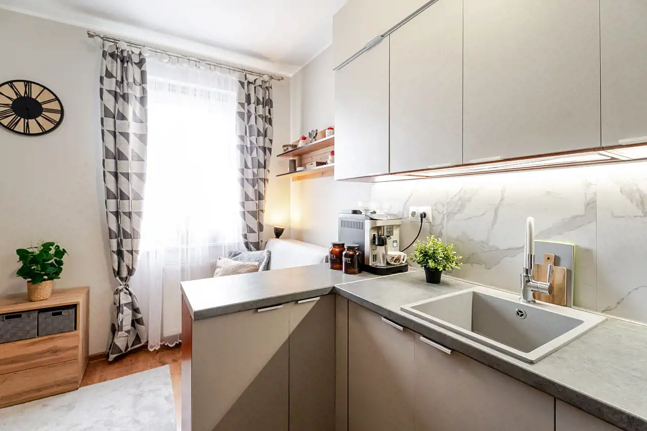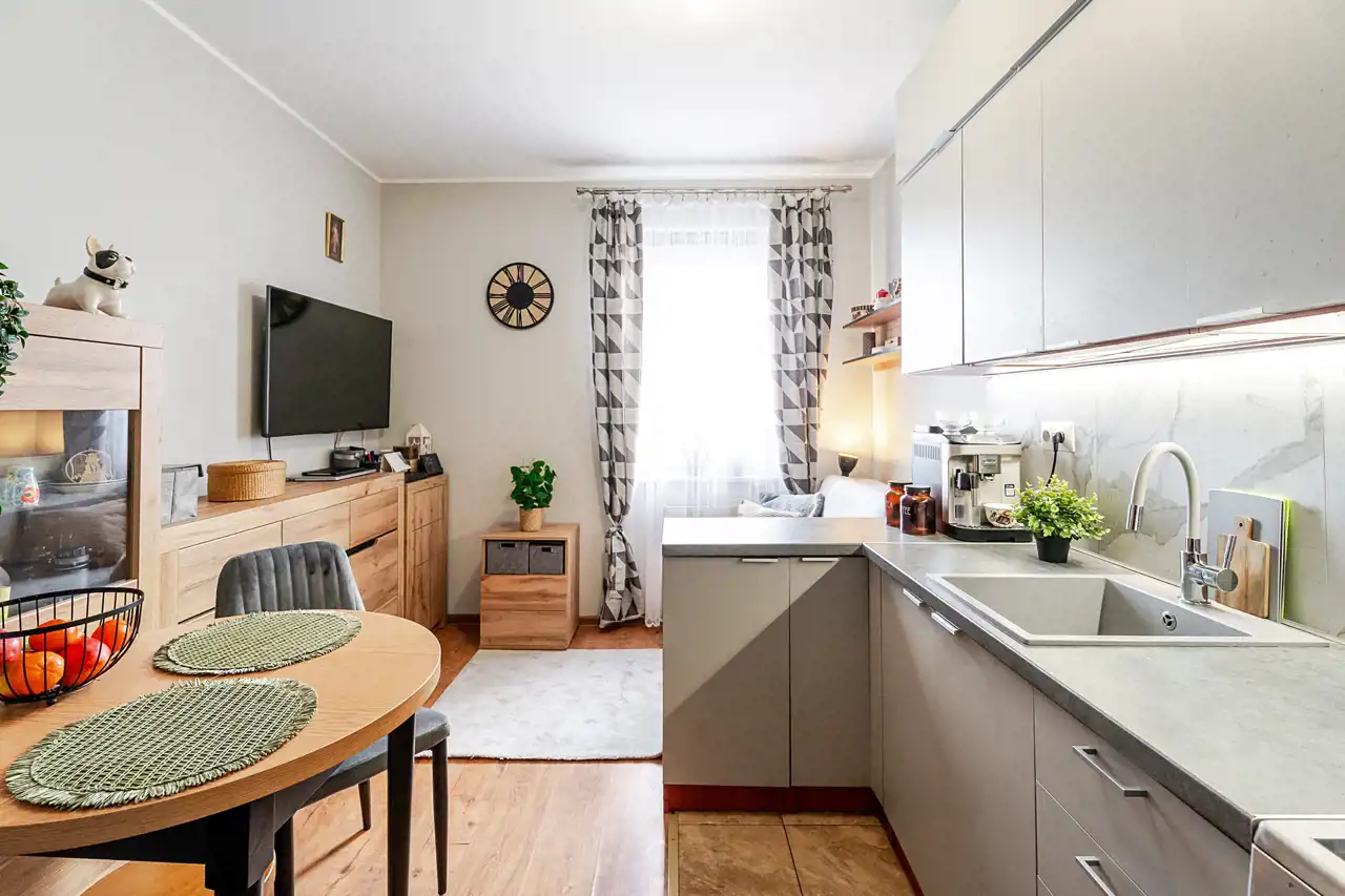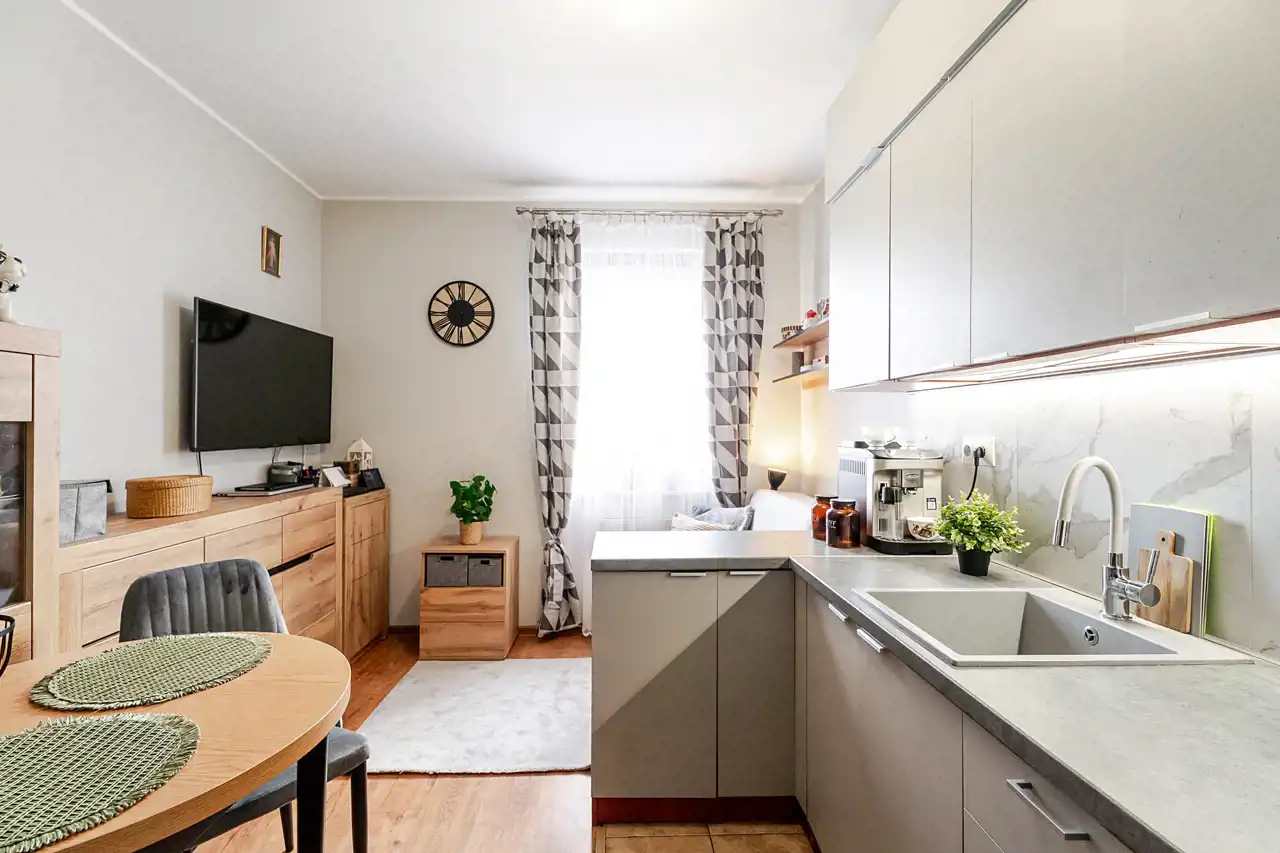 - jasny, przestronny salon z aneksem kuchennym