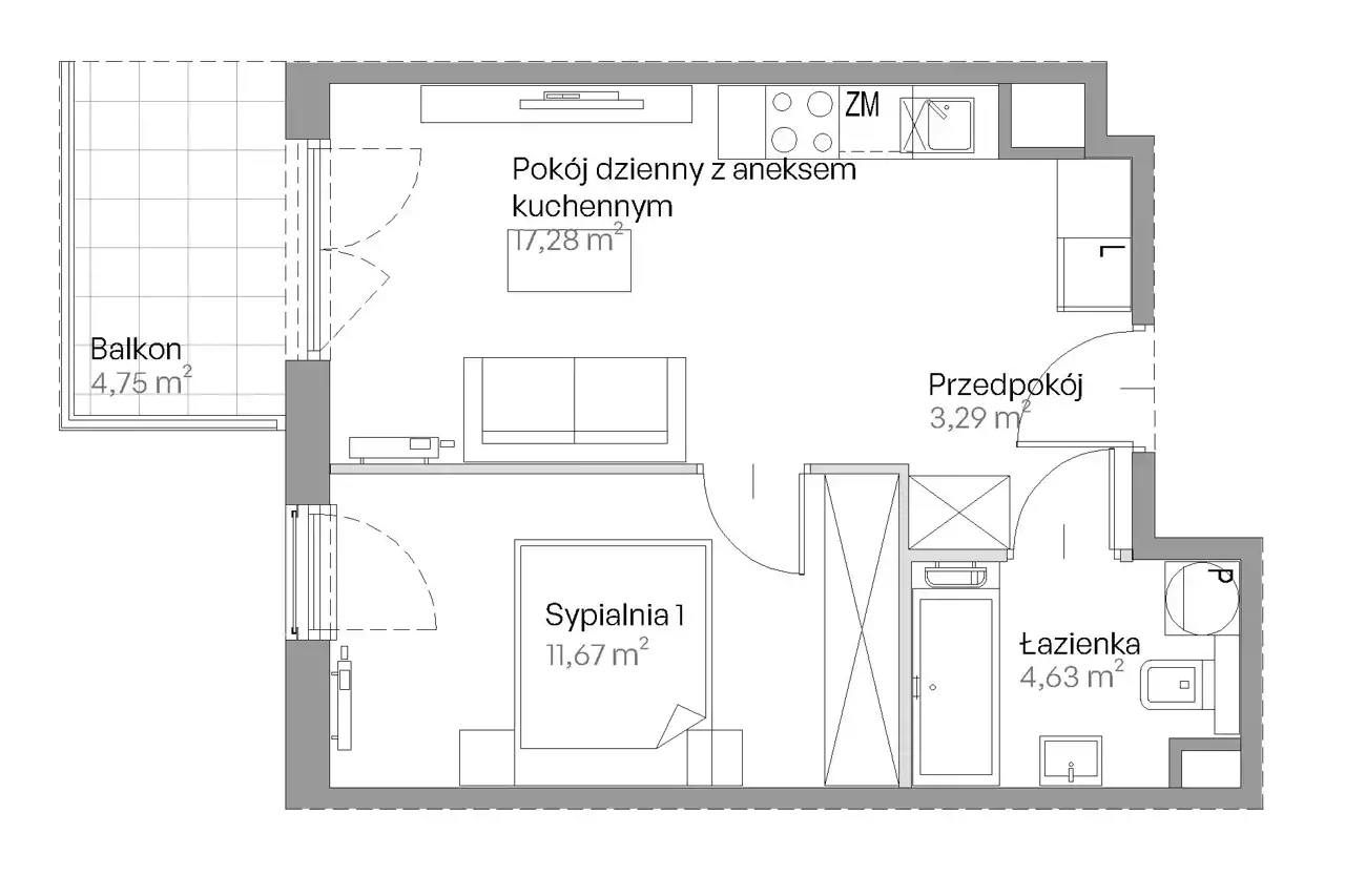 - Charakterystyka mieszkania 36.92 m2, 2 pokoje