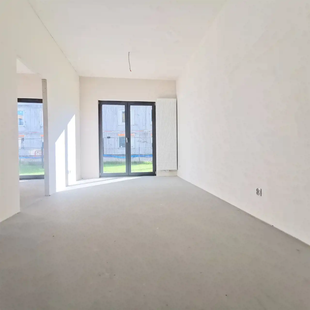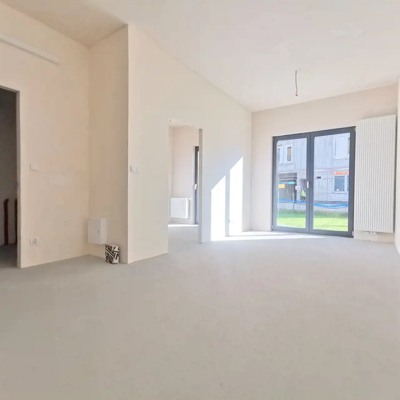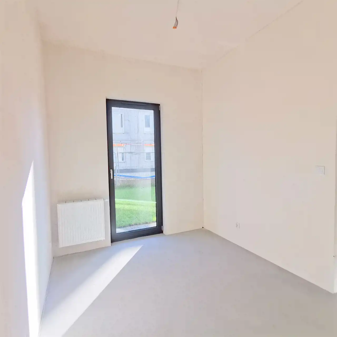 Mieszkanie składające się z salonu z aneksem kuchennym, sypialni, przedpokoju, łazienki oraz ogródka.