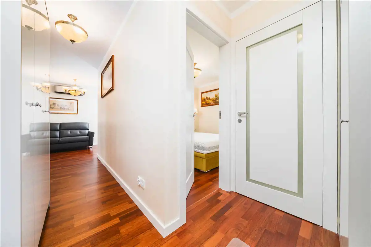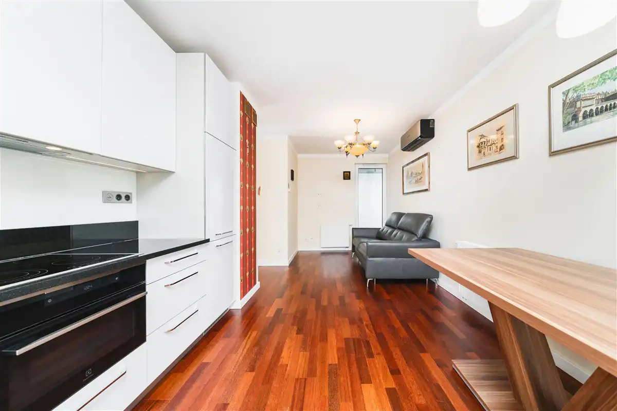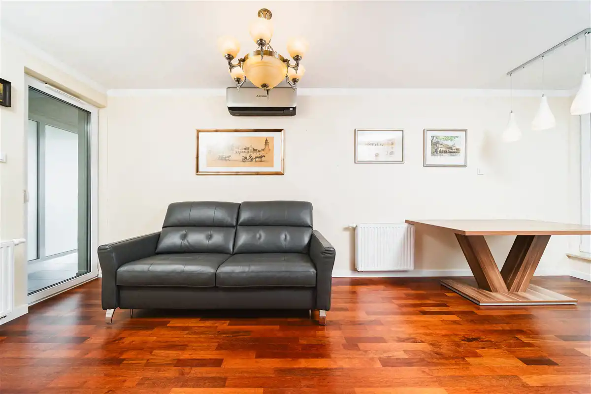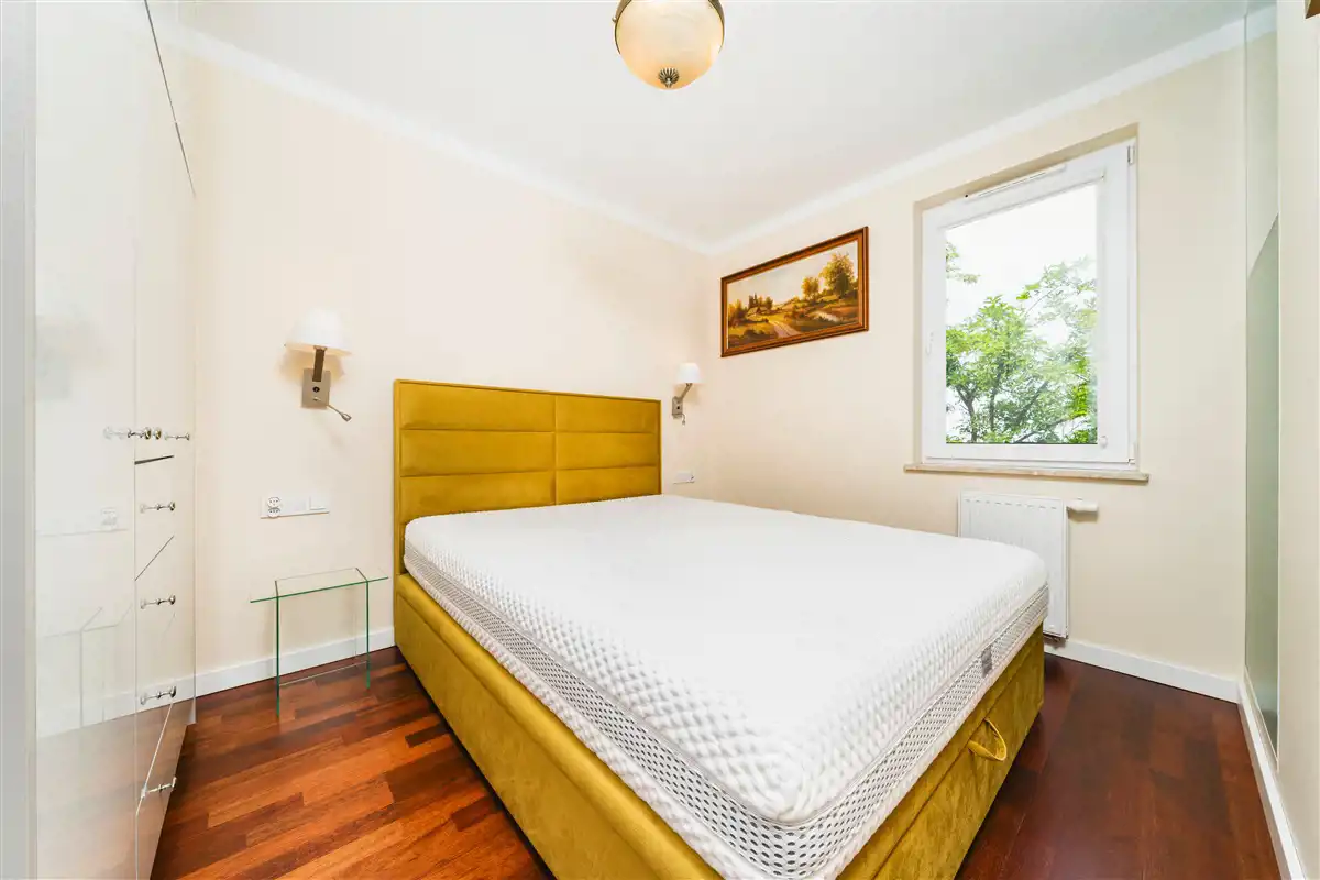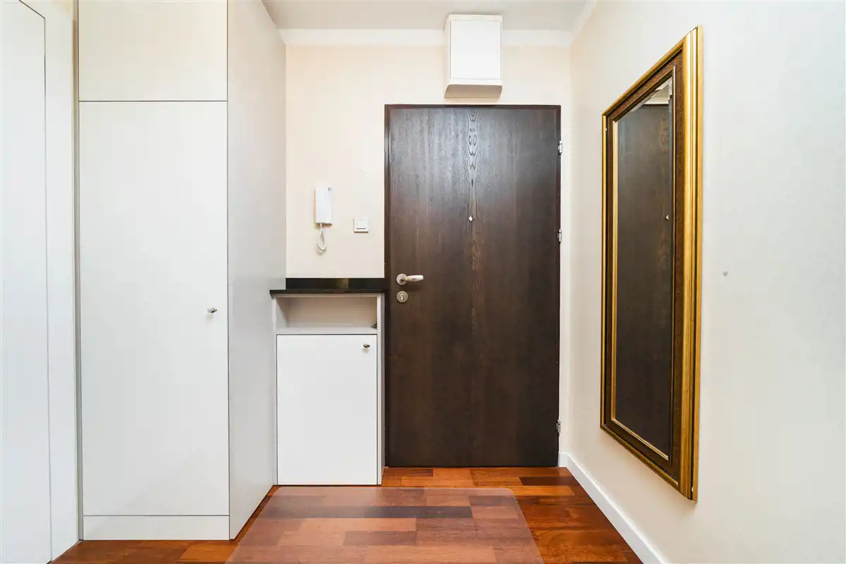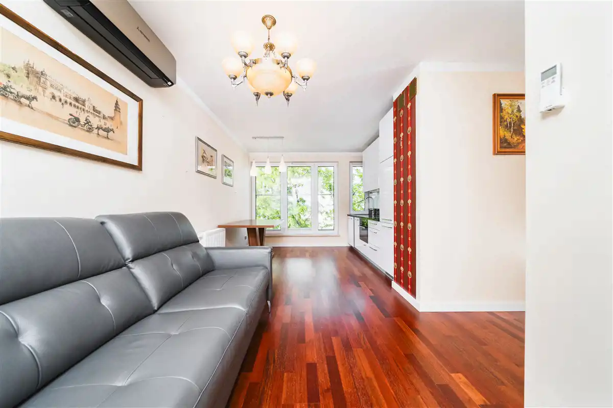 Mieszkanie sprzedawane z meblami, AGD w kuchni (meble ze specjalną warstwą ochronną), szafy w zabudowie - pozostają. Całe wyposażenie nowe. Na podłogach drzewo tekowe.