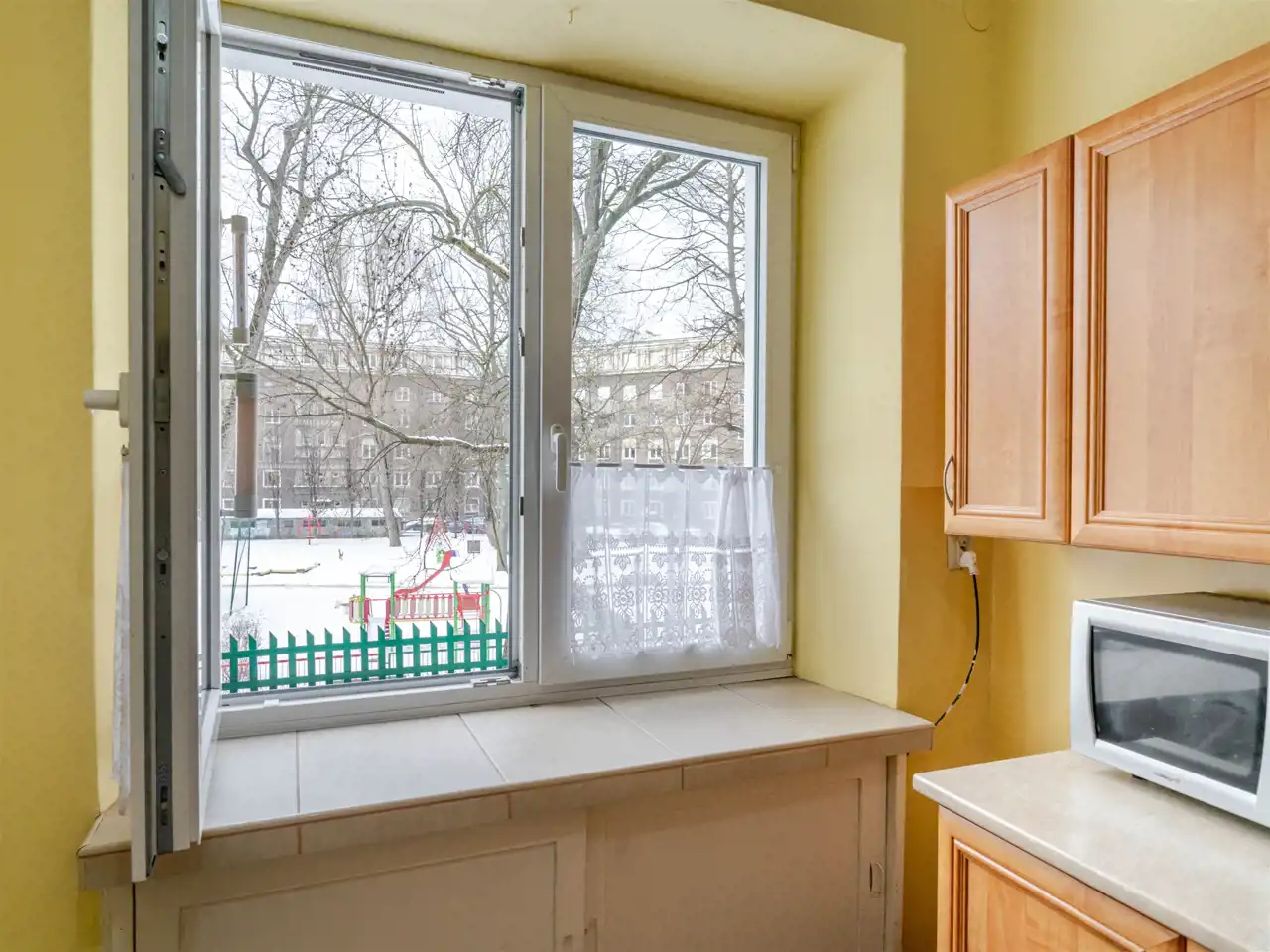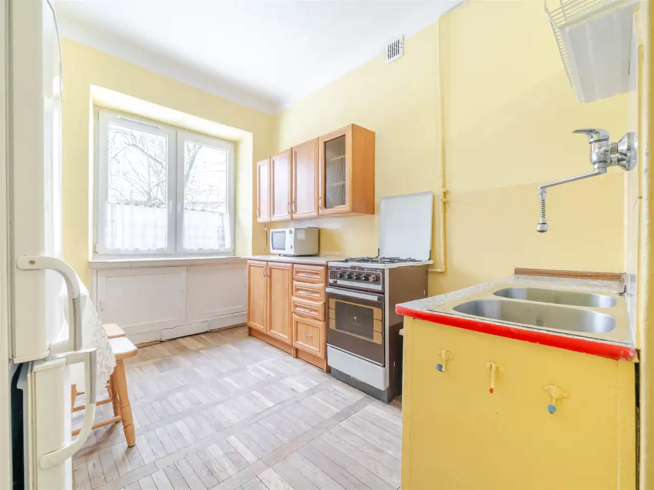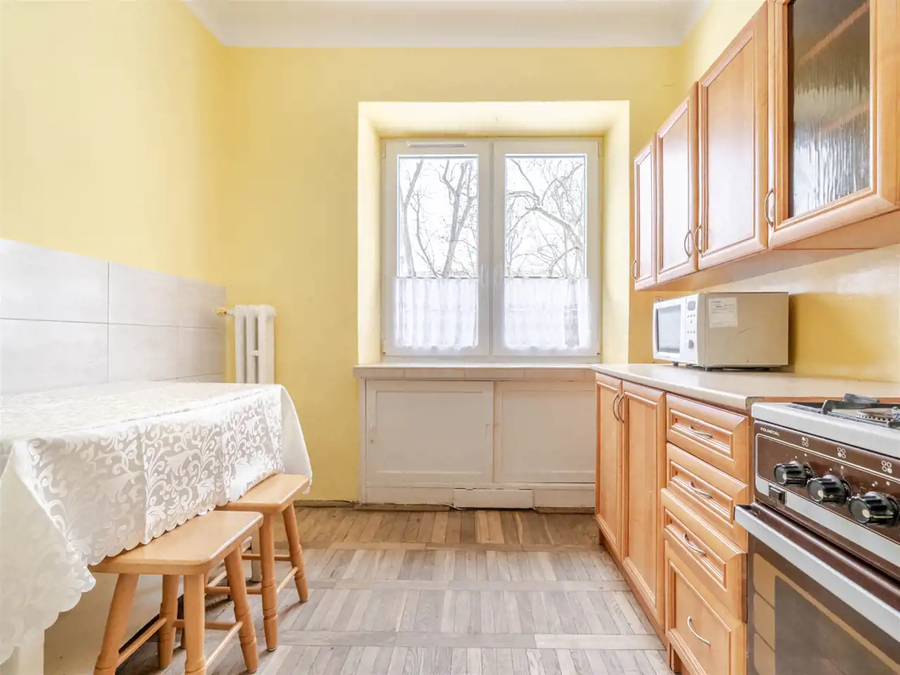 Składa się z 2 przestronnych pokoi o pow. 18,30 m2 i 14,60 m2, jasnej, oddzielnej kuchni o pow. 9,36 m2, łazienki (2,92 m2) i przedpokoju. Wysokość pomieszczeń - 2,78 m. Mieszkanie w dobrym stanie, ciche i jasne z widokiem na zielone podwórko. Ekspozycja okien w kuchni i pokojach: północno-zachodnia. Ogrzewanie i ciepła woda z sieci miejskiej. Okna PCV. Podłogi: w pokojach, kuchni i przedpokoju z parkietu, w łazience terakota. Do mieszkania przynależy piwnica. Idealny dostęp do komunikacji miejskiej. Tuż obok żłobek i przedszkole.