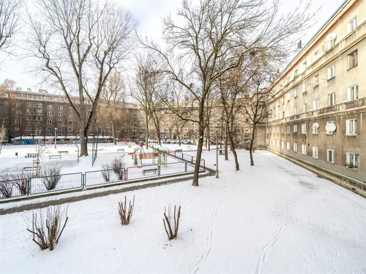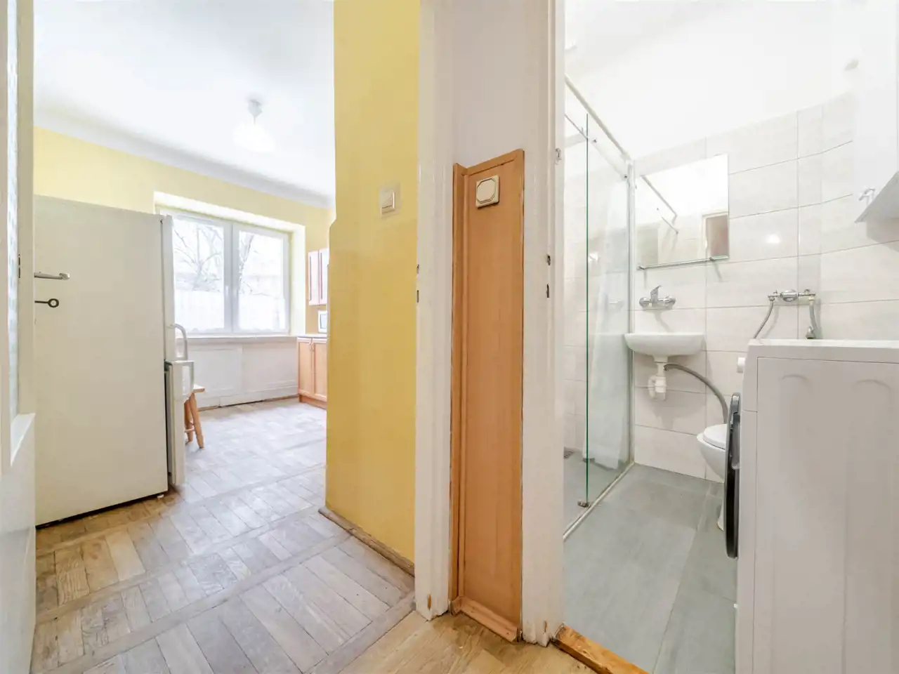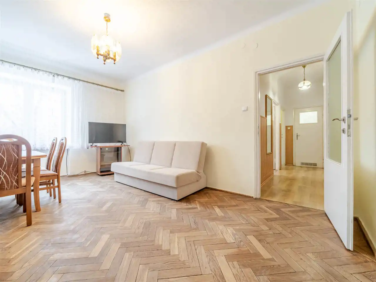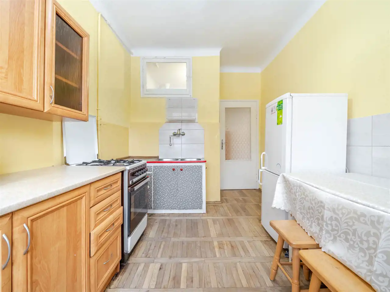 Składa się z 2 przestronnych pokoi o pow. 18,30 m2 i 14,60 m2, jasnej, oddzielnej kuchni o pow. 9,36 m2, łazienki (2,92 m2) i przedpokoju. Wysokość pomieszczeń - 2,78 m. Mieszkanie w dobrym stanie, ciche i jasne z widokiem na zielone podwórko. Ekspozycja okien w kuchni i pokojach: północno-zachodnia. Ogrzewanie i ciepła woda z sieci miejskiej. Okna PCV. Podłogi: w pokojach, kuchni i przedpokoju z parkietu, w łazience terakota. Do mieszkania przynależy piwnica. Idealny dostęp do komunikacji miejskiej. Tuż obok żłobek i przedszkole.