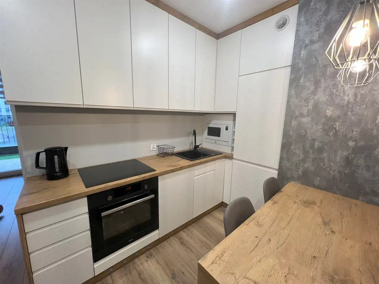 - pełnowymiarowa lodówka, piekarnik, płyta indukcyjna, zabudowana kuchenka mikrofalowa,