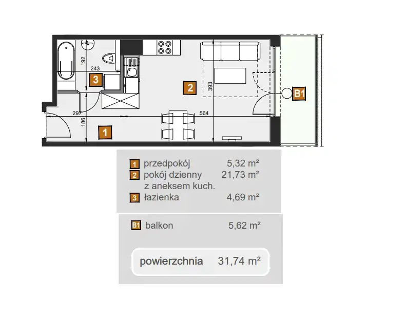 - Charakterystyka mieszkania 31.74 m2, 1 pokój