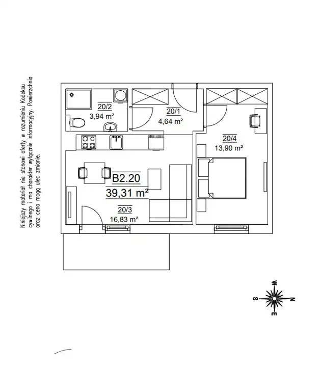 - Charakterystyka mieszkania 39.31 m2, 2 pokoje