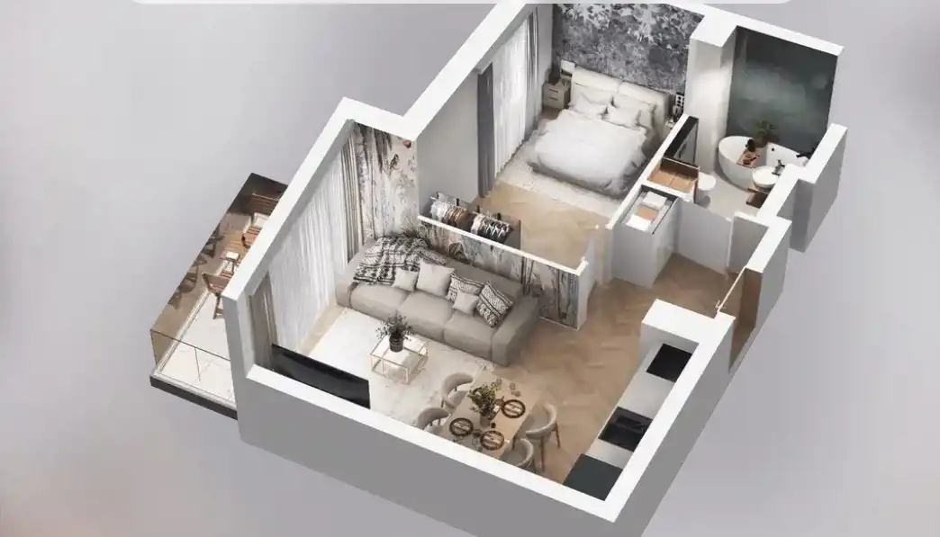 Mieszkanie składające się z salonu z aneksem kuchennym, sypialni, przedpokoju, łazienki oraz balkonu