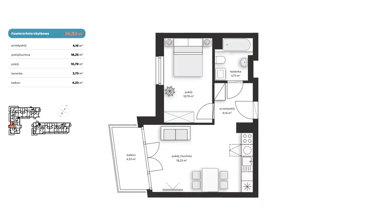 - Charakterystyka mieszkania 36.93 m2, 2 pokoje
