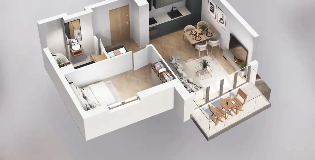 Mieszkanie składające się z salonu z aneksem kuchennym, sypialni, przedpokoju, łazienki oraz balkonu