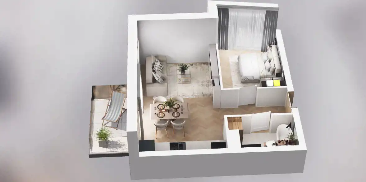 Mieszkanie składające się z salonu z aneksem kuchennym, sypialni, przedpokoju, łazienki oraz dwóch balkonów