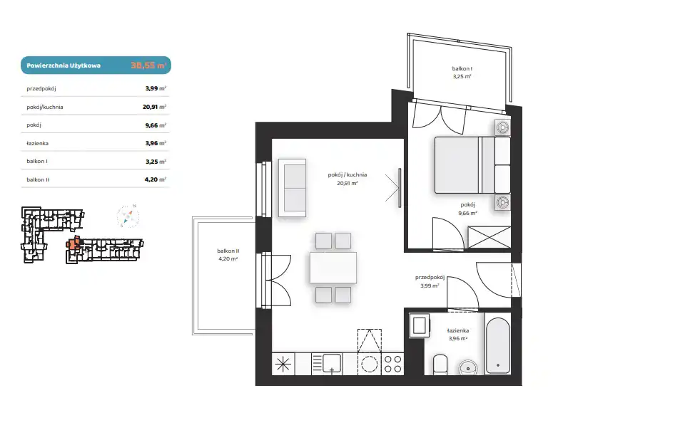 - Charakterystyka mieszkania 38.52 m2, 2 pokoje