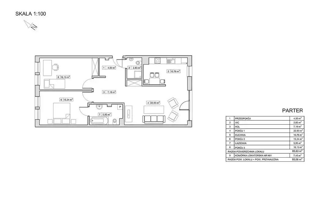 - Charakterystyka mieszkania 85.63 m2, 3 pokoje