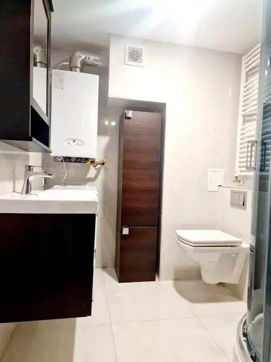 Mieszkanie jest w stanie do wprowadzenia i umeblowane. Ogrzewanie gazowe z pieca dwu funkcyjnego z racji istniejącej instalacji gazowej dostępnej w mieszkaniu. Podłogi mieszkania w części pokoi, łazienki i przedpokoju stanowi dobrej jakości gres podłogowy. Ściany w pomieszczeniach w tynkach gipsowych odmalowanych na biały kolor. Okna drewniane dwuszybowe z ekspozycją na ogród, podworzec oraz panoramę miasta. Mieszkanie ciche. Czynsz do administracji wynosi 163 zł na co składają się opłaty za zaliczkę eksploatacyjną, fundusz remontowy, zimna wody, wywóz śmieci, ubezpieczenie budynku, przeglądy, oświetlenie części wspólnych, sprzątanie.