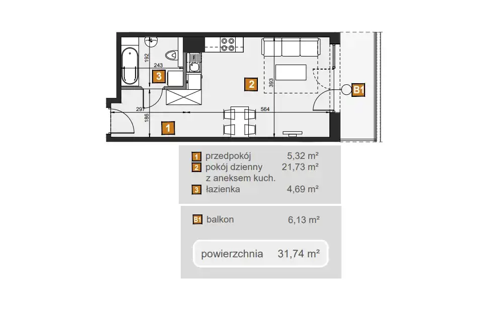 - Charakterystyka mieszkania 31.74 m2, 1 pokój