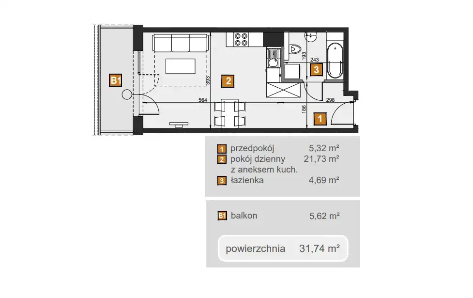 - Charakterystyka mieszkania 31.74 m2, 2 pokoje