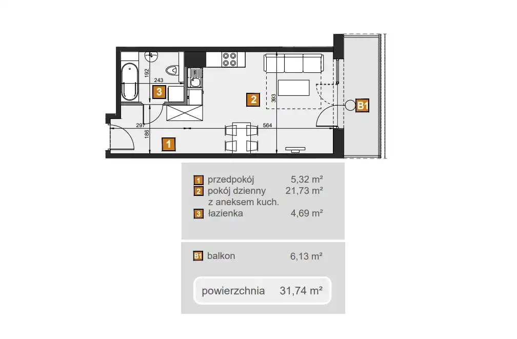 - Charakterystyka mieszkania 31.74 m2, 1 pokój
