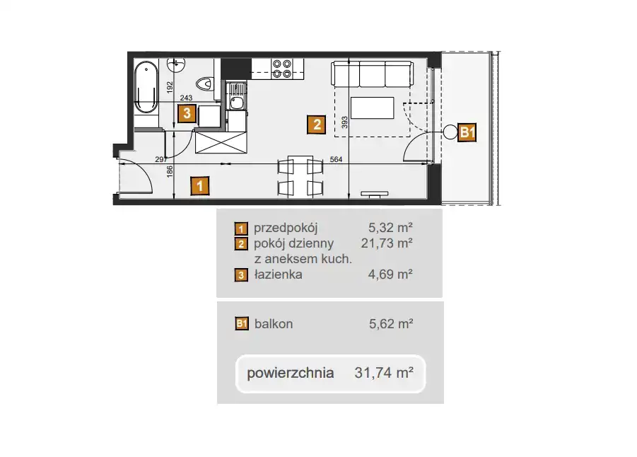- Charakterystyka mieszkania 31.74 m2, 1 pokój