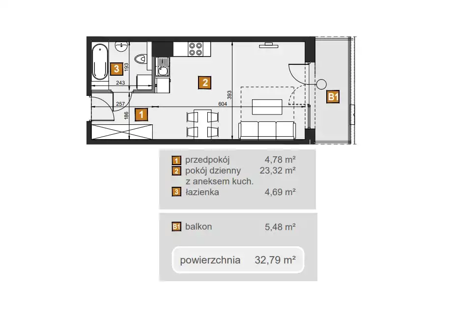 - Charakterystyka mieszkania 32.79 m2, 1 pokój