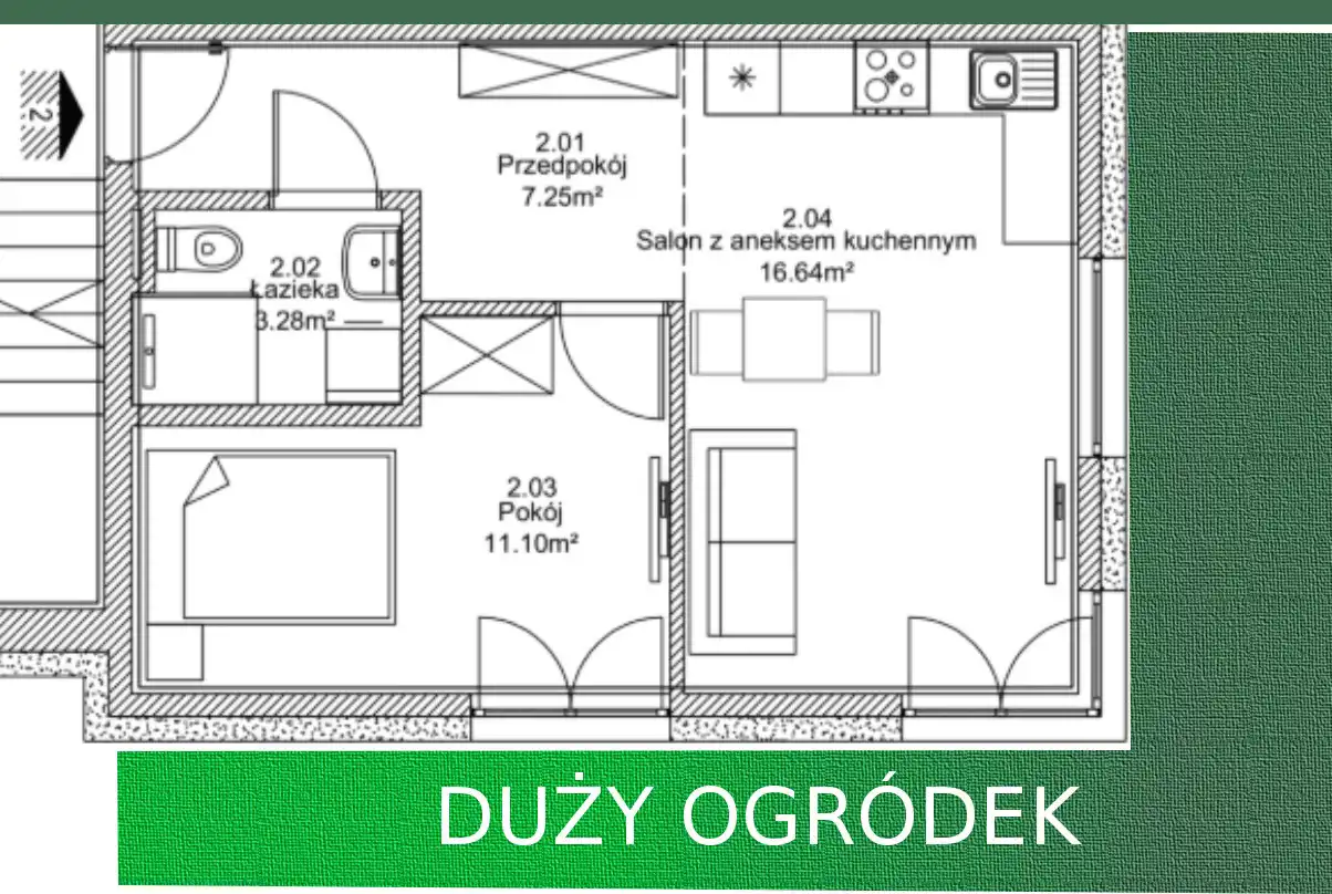 NR 2 - Metraż: 38,27 m² | Taras ziemny / Ogród: 72 m² | Cena: 619 974 zł brutto.